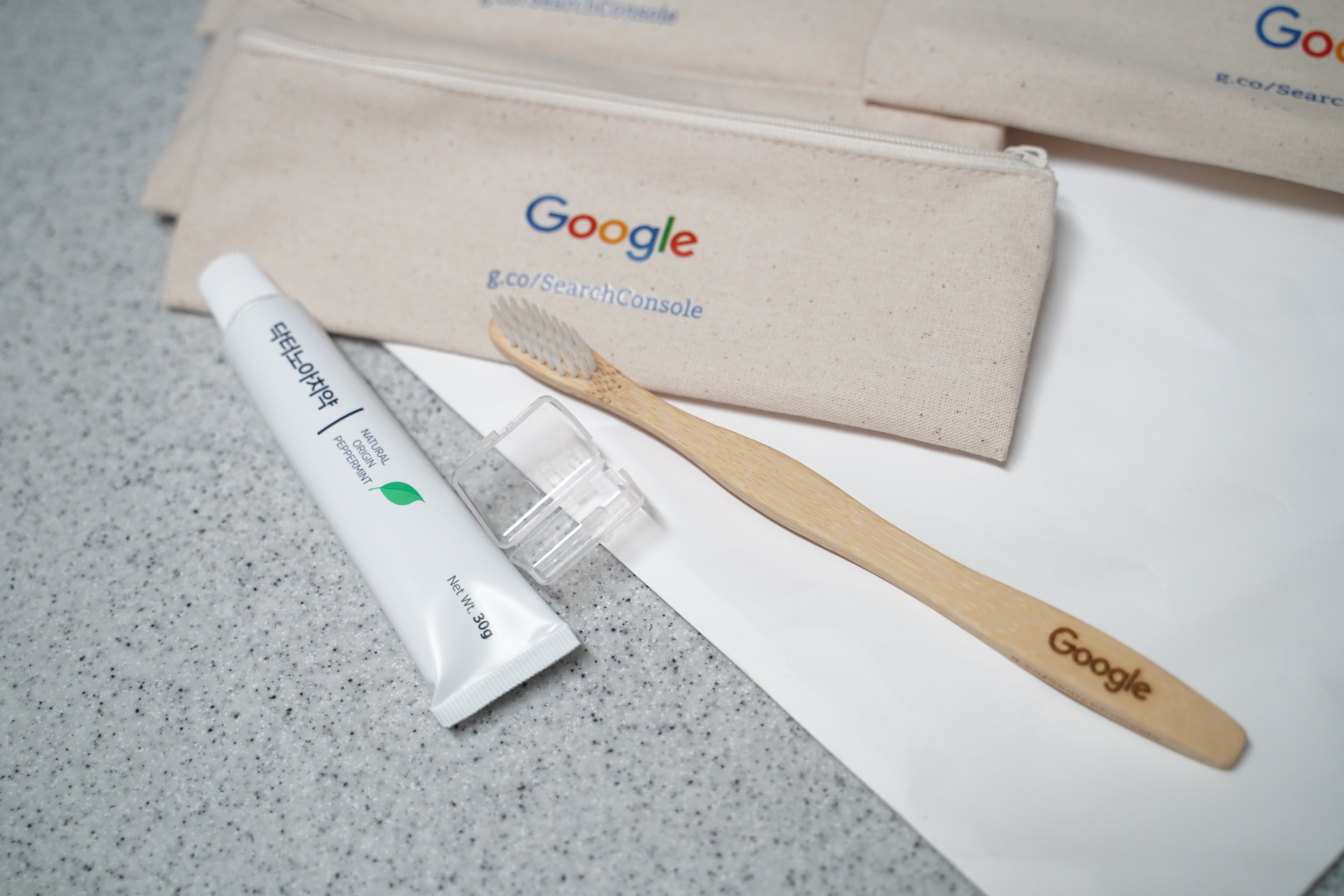 구글 서치콘솔이 그려진 케이스, 구글 로고 그려진 칫솔 등 친환경적인 소재를 활용한 것 같다.